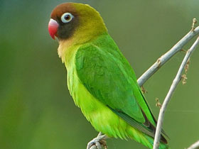 Их также называют клубничноголовыми. Самые маленькие из масковых. Алый лоб, такие же бока и горло, но с оттенком желтизны. Действительно — ягодка. Кольца на глазницах широкие. На общем тёмно-зелёном фоне это очень впечатляет. Пронзительно верещит в полёте. Окрас одинаков, от пола не зависит. Купить сложно, вывоз их с континента под запретом.