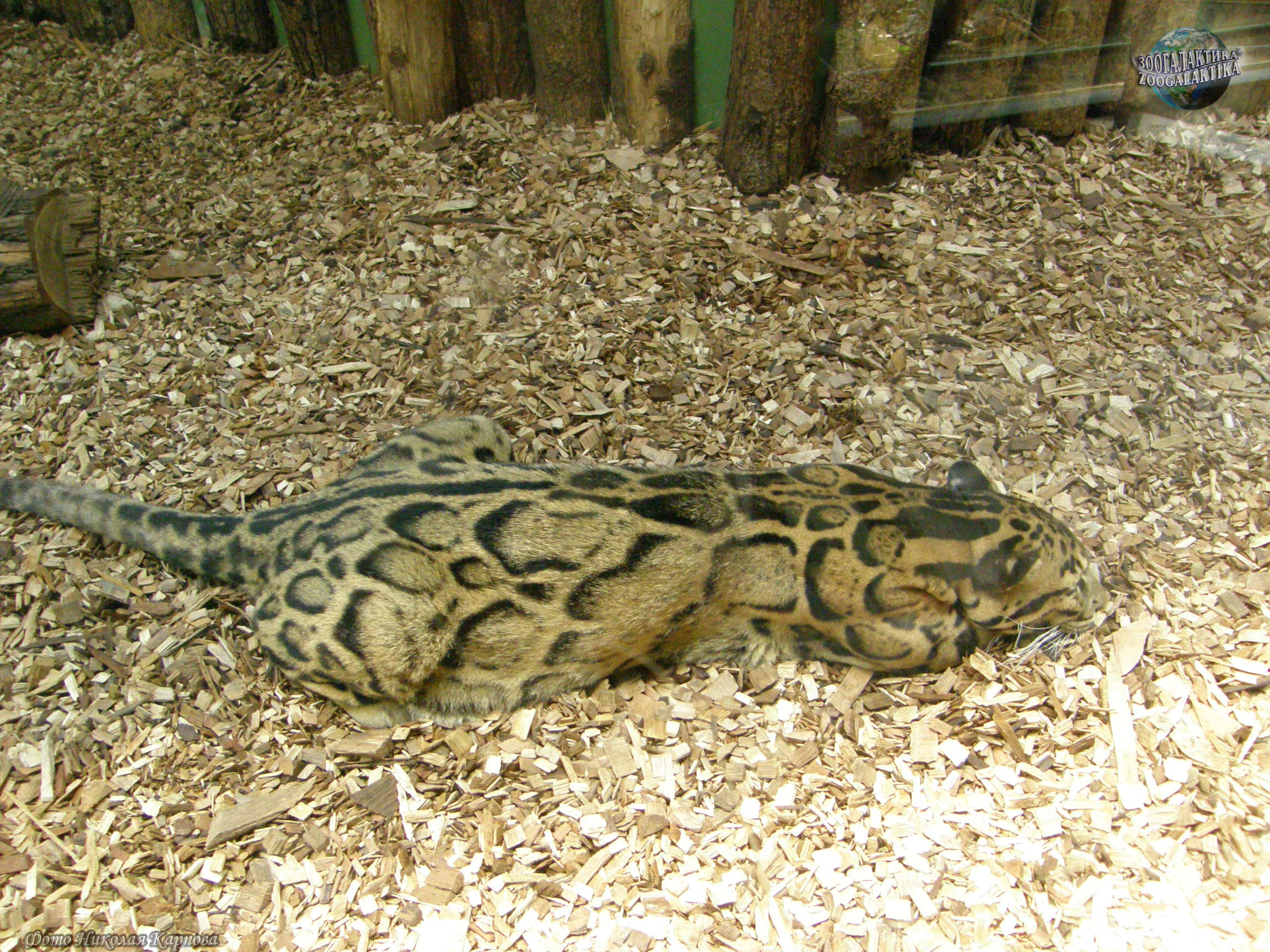 Вопреки своему названию этот хищник не имеет прямого отношения к настоящим леопардам. Он настолько отличается от других кошачьих морфологически и экологически, что его выделяют в особый род Neofelis, что значит "новый кот", занимающий промежуточное положение между мелкими и крупными кошками. По строению черепа и зубов дымчатый леопард ближе к крупным кошачьим, но есть у него и черты, роднящие его с мелкими кошками. Например, из-за того, что подъязычная кость у него полностью окостенела, дымчатый леопард умеет мурлыкать; зрачок у него яйцевидный, а не круглый. Клыки у этого красивейшего хищника больше, чем у остальных кошек в пропорции к размерам тела - возможно, эта адаптация позволяет ему удерживать добычу, пойманную на деревьях (где сделать это труднее, чем на земле). Длинные клыки (до 4,5 см) также помогают легко убить пойманную добычу единым укусом. Этому также способствует широкий промежуток между клыками и премолярами, дающий возможность леопарду делать очень большие и глубокие укусы. Челюсти дымчатого леопарда могут открываться шире, чем у любого другого кота. По размерам этот зверь довольно крупный: длина его тела от 70 до 106 см, не считая 90-сантиметрового хвоста (60-90 см), вес от 16 до 25 кг. Интересно, что самцы дымчатого леопарда могут быть более, чем вдвое крупнее самок - это наибольшая разница размера между полами у Кошачьих. Тело у дымчатого леопарда вытянутое, гибкое, ноги короткие, с широкими лапами и жесткими голыми мозолями, удобными для лазанья по деревьям. Густая шерсть сероватого или желтоватого цвета с великолепным рисунком из широких и узких отметин в виде кругов, розеток, овалов, у которых задние края очерчены значительно отчетливее, чем передние, что еще более усиливает эффектность раскраски.