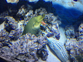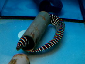 Семейство Муреновые (Muraenidae) - это крупные хищные рыбы, которых не спутаешь ни с какими другими обитателями рифа из-за характерной змеевидной формы тела. Сходство усугубляется безобразной головой с маленькими глазками и огромной пастью. У мурен нет ни грудного, ни брюшного плавников, и передвигаются они с помощью длинных спинного и анального плавников, которые идут по всей длине туловища. У них очень сильные челюсти и многочисленные игловидные зубы, которыми они могут нанести рваные болезненные раны. Иногда зубы настолько велики, что мурена не может полностью закрывать рот. Жаберные щели у этих рыб открываются небольшими округлыми отверстиями по бокам тела, у них нет плавательного пузыря. Около 200 видов мурен обитают в тропических и субтропических водах всех океанов, среди них встречаются настоящие гиганты весом до 50 кг и диной свыше 3 метров.