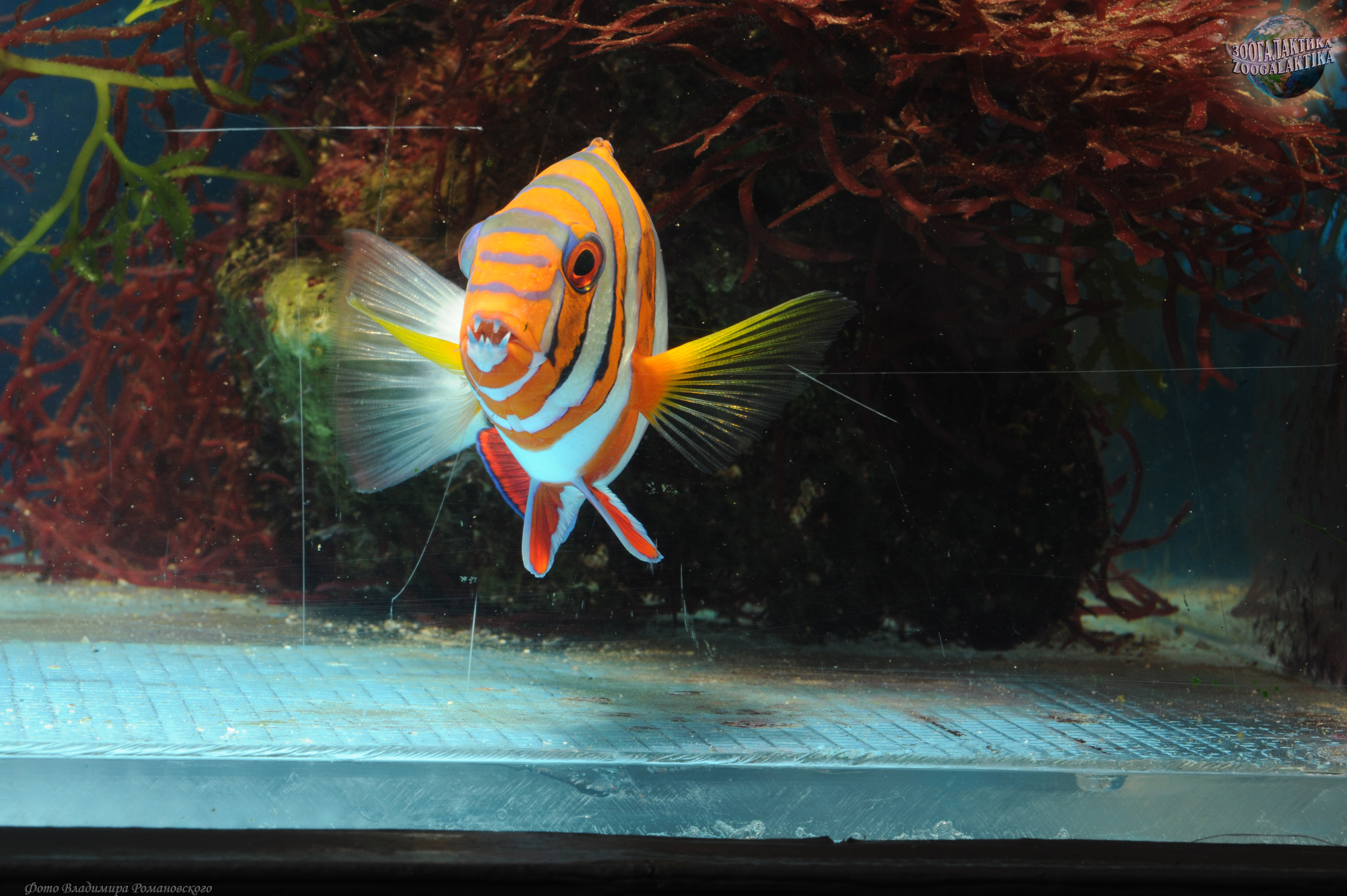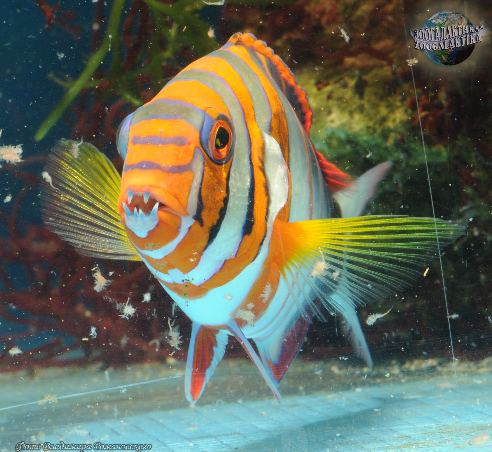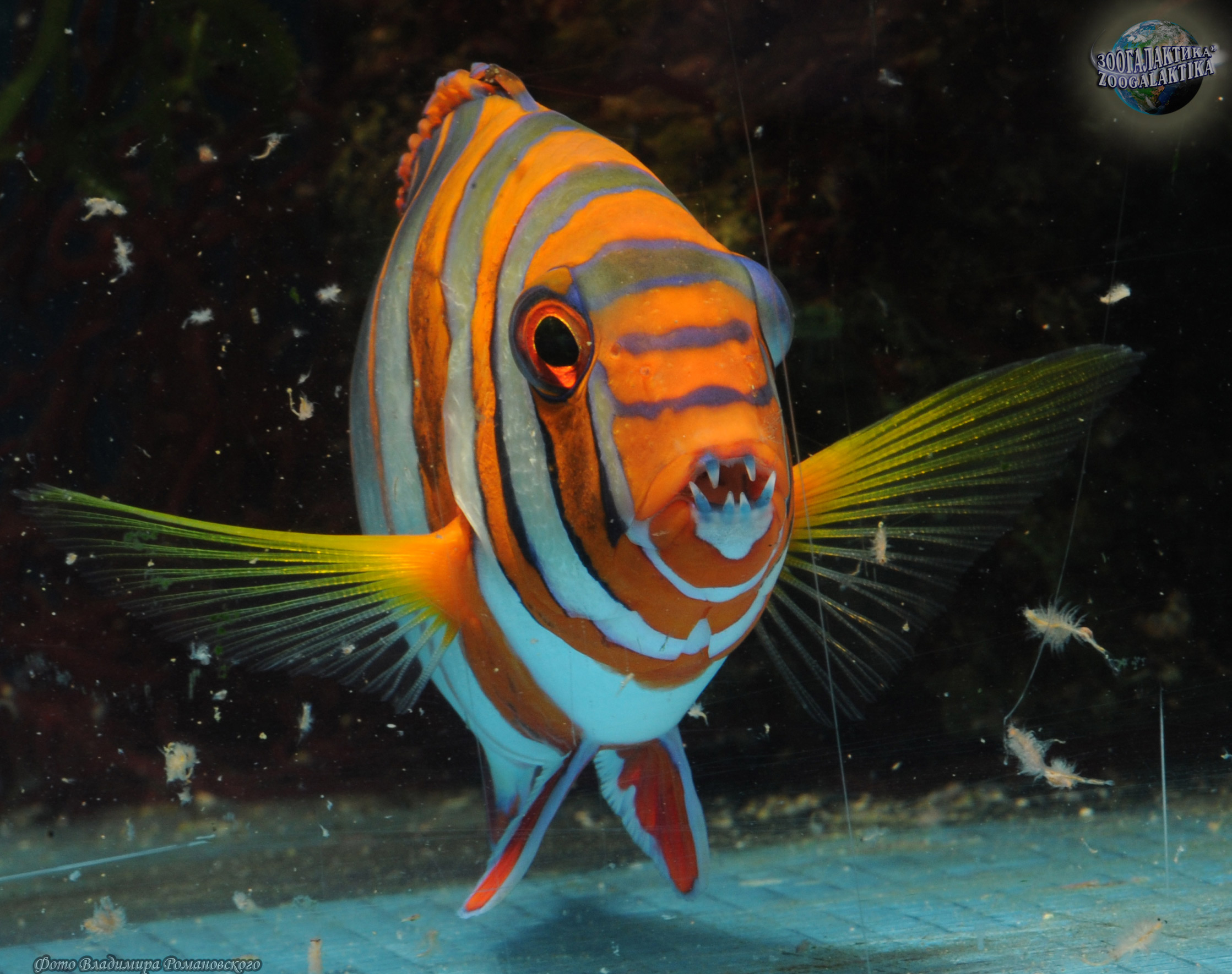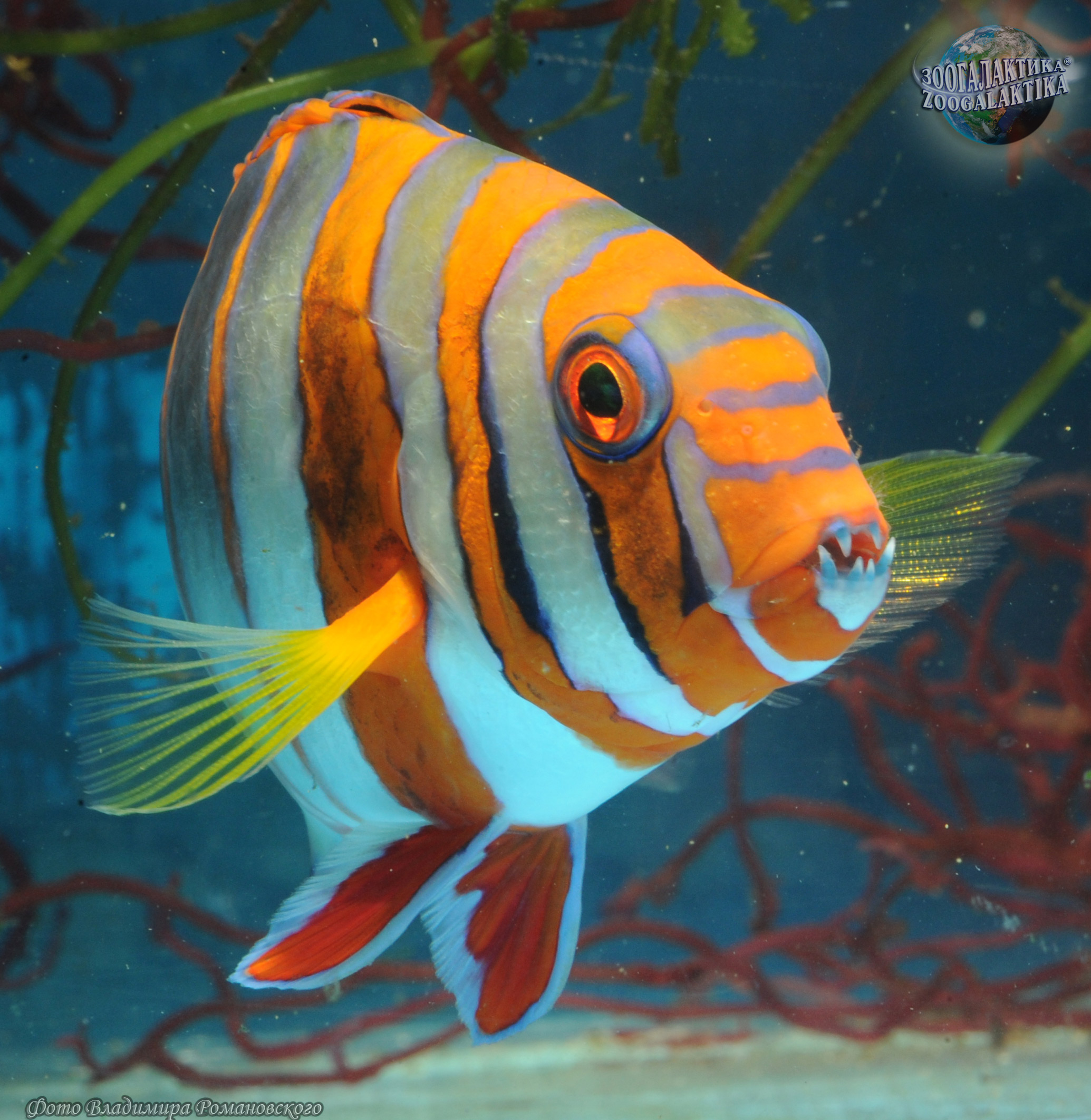 Полосатый клыкастый губан широко распространен в западной части Тихого океана, а также встречаются от южных берегов Японии до Австралии. У этой яркой рыбы имеются четыре выступающих зуба, используемые для захвата и разрывания жесткой добычи, в частности, ракообразных. Благодаря необычной окраске полосатых губанов (красные или оранжевые полосы на белом или синем фоне), их невозможно перепутать с другими рыбами. Окраска молодых особей практически не отличается от окраски взрослых арлекинов, за исключением «глазков» – пятен, имитирующее глаза, которые появляются на спинном и анальном плавниках с возрастом. Рацион полосатых губанов включает многих донных беспозвоночных с жесткими раковинами, небольших крабов, креветок и рыб.
